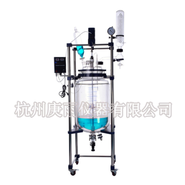 本機具有電動恒速攪拌系統(tǒng)、冷凝、滴加系統(tǒng),釜體夾層需外接加熱或制冷的循環(huán)設(shè)備。在攪拌物料的同時,通過夾層注入循環(huán)的熱溶液或冷卻液,對釜內(nèi)的物料進行恒溫的加熱或制冷。物料進行加熱反應(yīng)時,在真空條件下可以提高蒸發(fā)效率(需連接真空裝置),溶媒蒸汽經(jīng)玻璃冷凝盤管時冷卻成液體(需連接冷卻裝置),可回流到釜內(nèi),也可通過回流彎頭下部閥門進行回收。反應(yīng)完畢,物料可從釜底的側(cè)出料口放出。