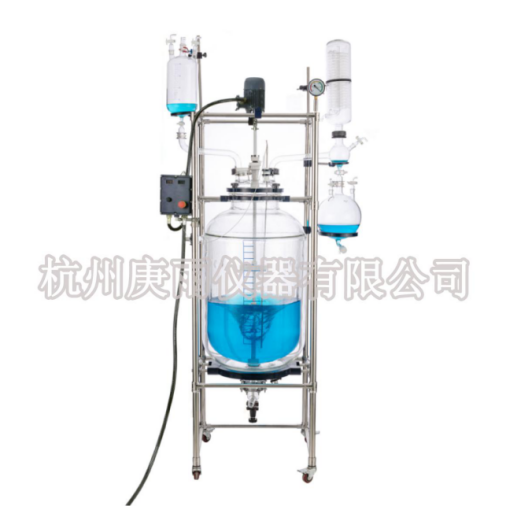 本機(jī)具有電動(dòng)恒速攪拌系統(tǒng)、冷凝、滴加系統(tǒng),釜體夾層需外接加熱或制冷的循環(huán)設(shè)備。在攪拌物料的同時(shí),通過夾層注入循環(huán)的熱溶液或冷卻液,對(duì)釜內(nèi)的物料進(jìn)行恒溫的加熱或制冷。物料進(jìn)行加熱反應(yīng)時(shí),在真空條件下可以提高蒸發(fā)效率(需連接真空裝置),溶媒蒸汽經(jīng)玻璃冷凝盤管時(shí)冷卻成液體(需連接冷卻裝置),可回流到釜內(nèi),也可通過回流彎頭下部閥門進(jìn)行回收。反應(yīng)完畢,物料可從釜底的側(cè)出料口放出。