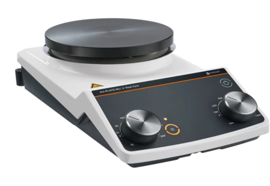 貫徹“簡單的攪拌和加熱”的理念,我們的入門級(jí)型號(hào)Hei PLATE Mix‘n’heat Core設(shè)計(jì)有兩個(gè)旋轉(zhuǎn)旋鈕,可直接使用兩個(gè)主要功能。速度和溫度用刻度設(shè)置,最大值為1400 rpm和300°C。