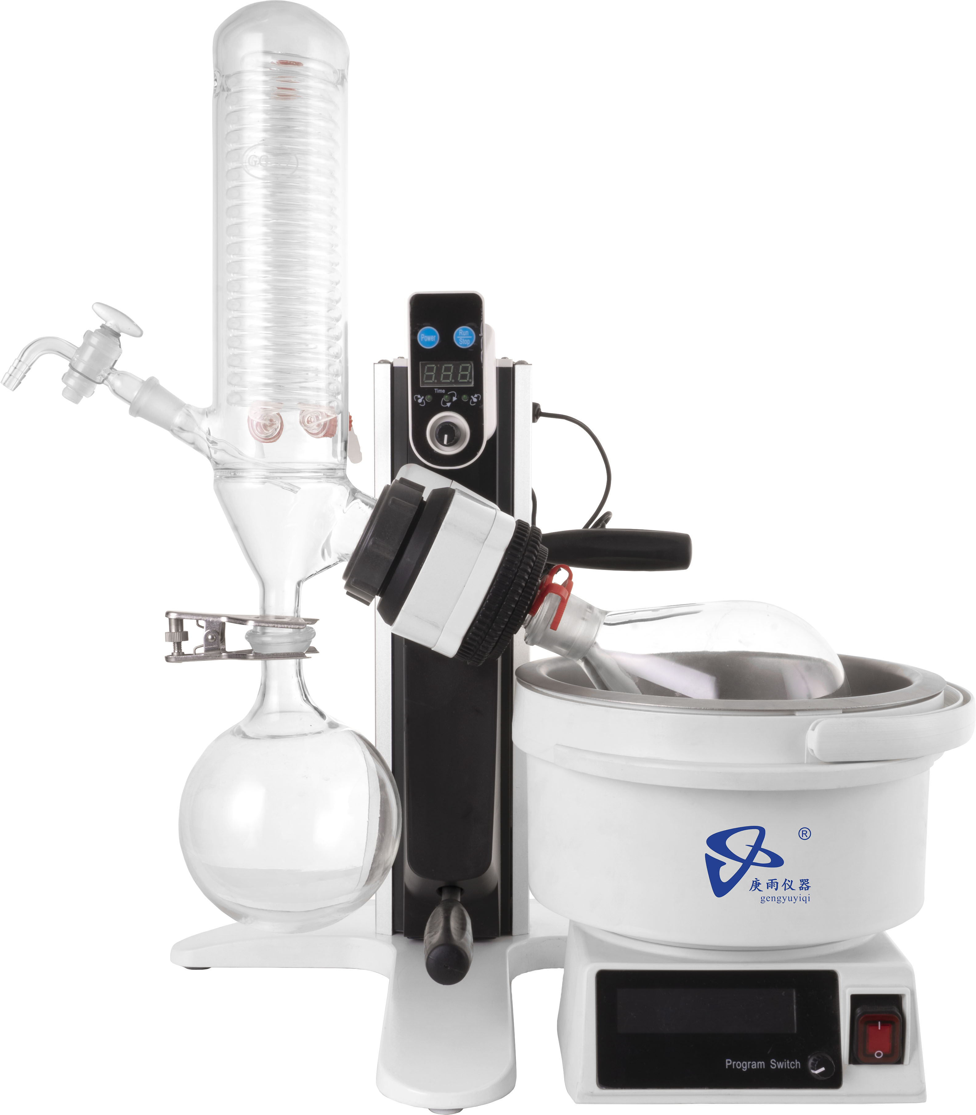 特點:蒸發(fā)瓶恒速旋轉(zhuǎn),水浴鍋恒溫加熱,在此條件下:物料在蒸發(fā)瓶內(nèi)壁形成大面積均勻薄膜快速蒸發(fā),在真空條件下可以提高蒸發(fā)效率(需連接真空裝置),溶媒蒸汽經(jīng)玻璃冷凝盤管時冷卻成液體(需連接冷卻裝置),回收于收集瓶。
