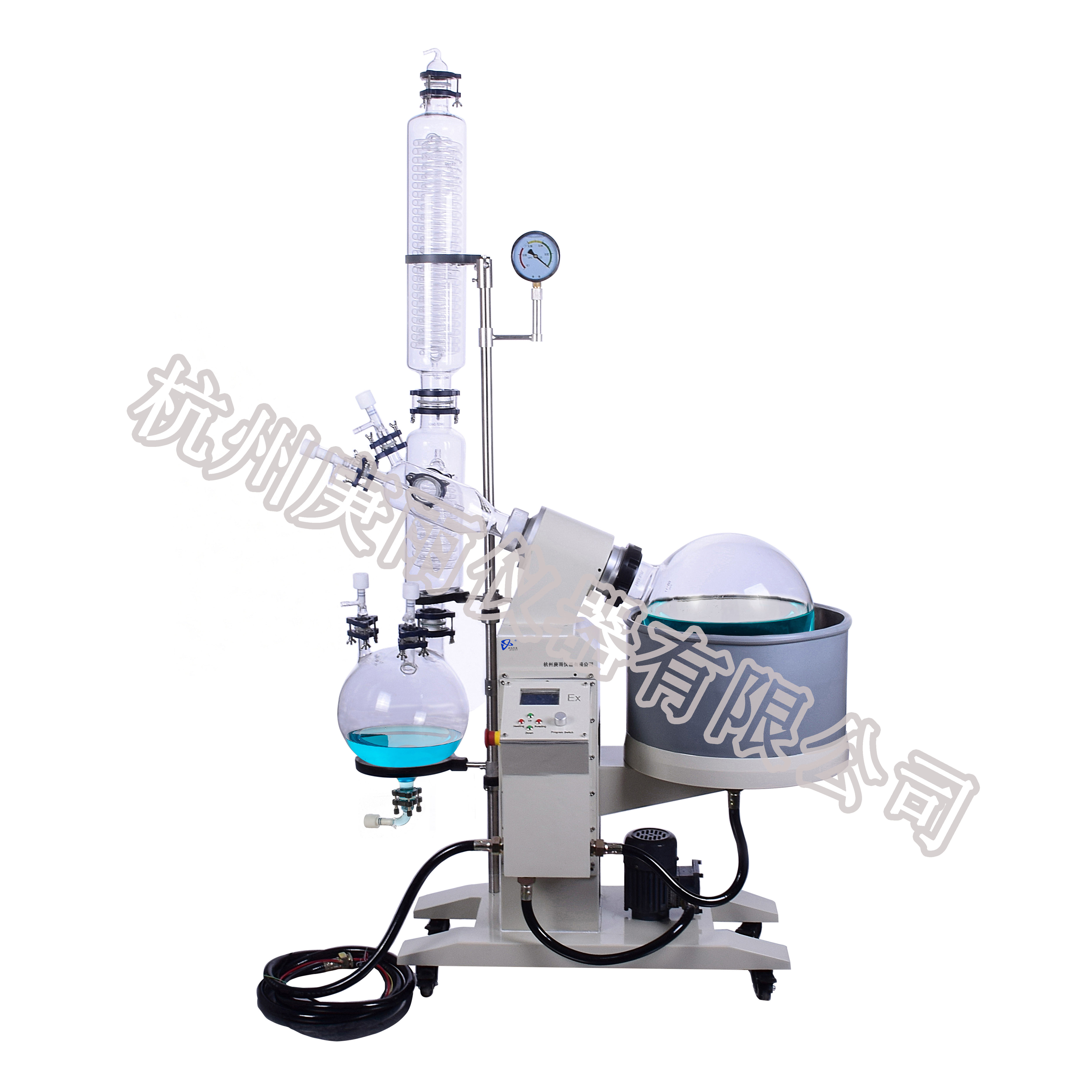 蒸發(fā)瓶恒速旋轉(zhuǎn),水浴鍋恒溫加熱,在此條件下:物料在蒸發(fā)瓶內(nèi)壁形成大面積均勻薄膜,在真空條件下可以提高蒸發(fā)效率(需連接真空裝置),溶媒蒸汽經(jīng)玻璃冷凝盤管時冷卻成液體(需連接冷卻裝置),回收于收集瓶。