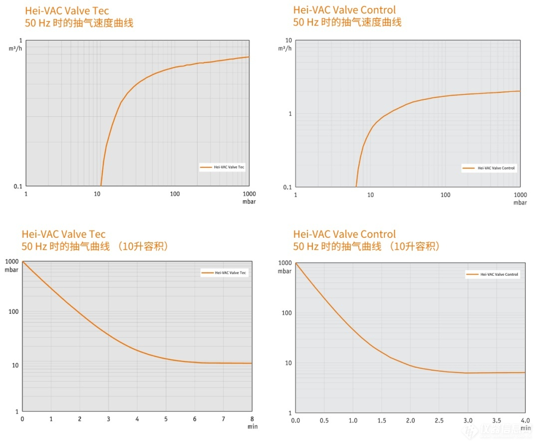 可以從上圖看出,真空泵運(yùn)行一段時間后,在相同真空度情況下,hei-vac valve control的抽氣速率高于hei-vac valve tec,hei-vac valve control的能效更高。
